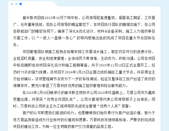 萬君再創(chuàng)新高┉75天┉達成機械竣工 丨 普米斯項目榮獲“優(yōu)秀合作團隊獎”客戶贊譽